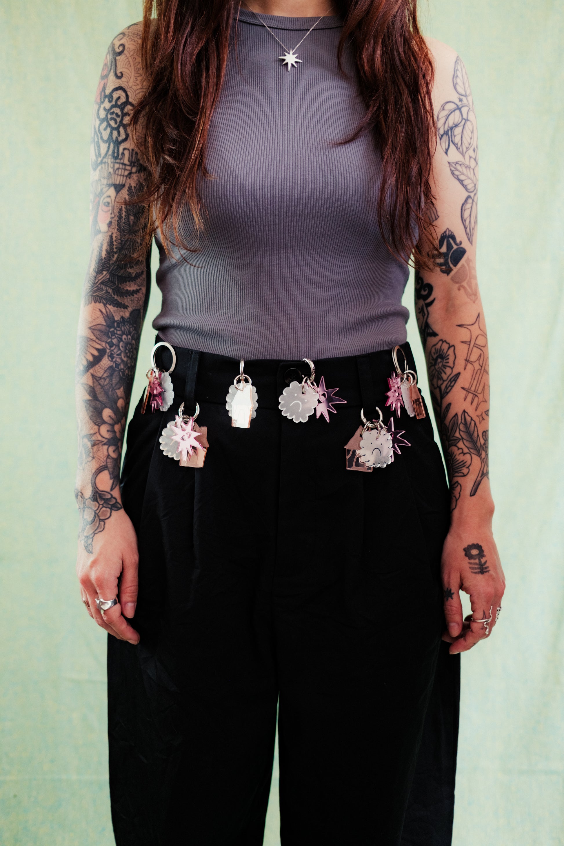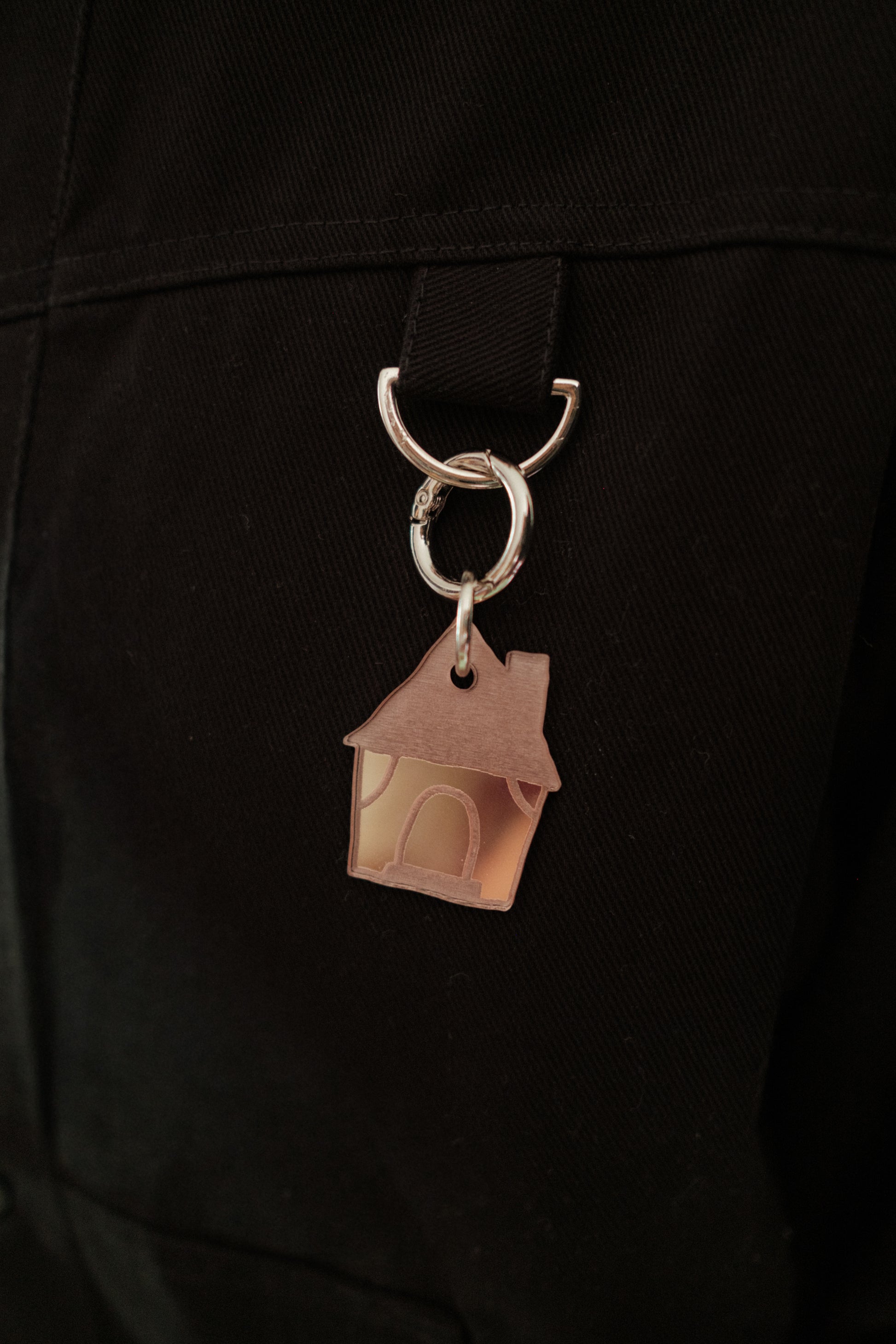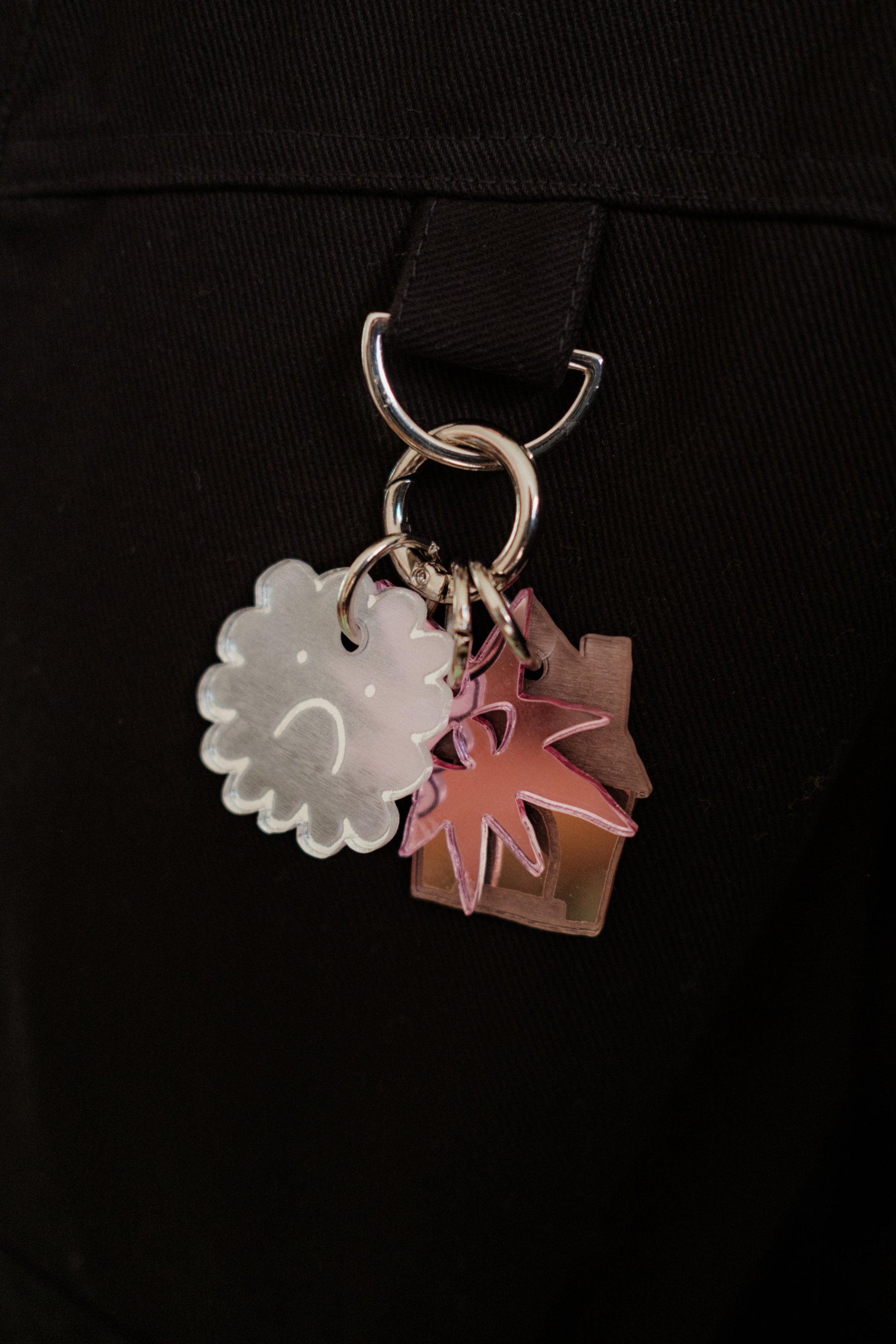 Set de llaveros en acrílico de espejo. Herrajes en materiales inoxidables.